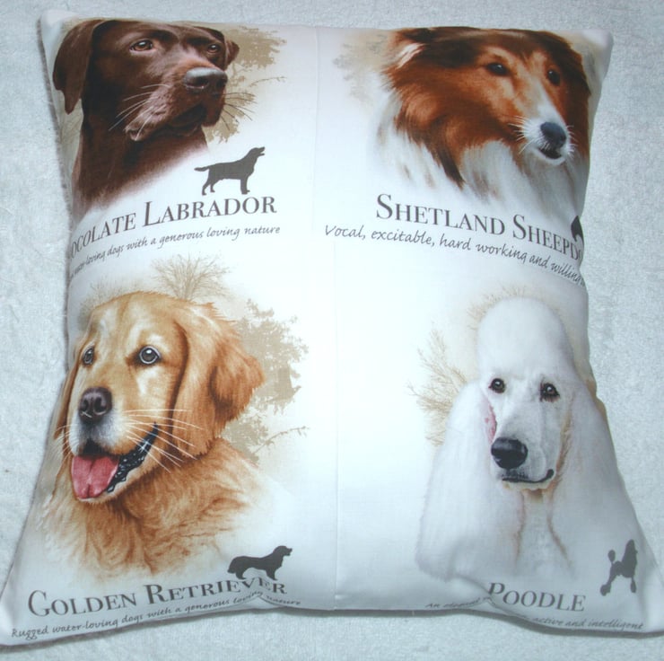 Chocolate Labrador, Sheltie, Golden Retriever and Poodle portraits cushion with a brief description below each picture. very clear images.