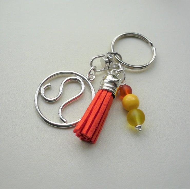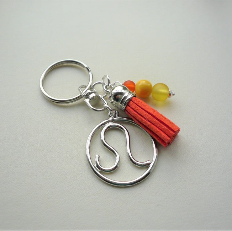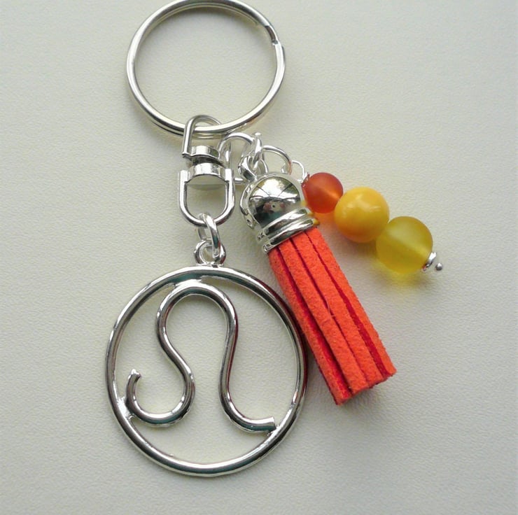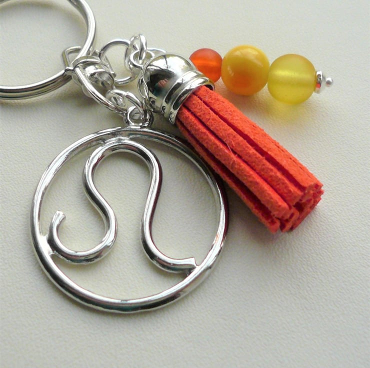 Pretty yellow and orange coloured LEO Zodiac star sign themed keyring or bag charm made up of of glass beads with a co-ordinating 35mm suede tassel with 30mm round silver plated Leo symbol charm hanging below. All attached to a 25mm silver plated swivel keyring. Total length incl ring is approx 8cm.