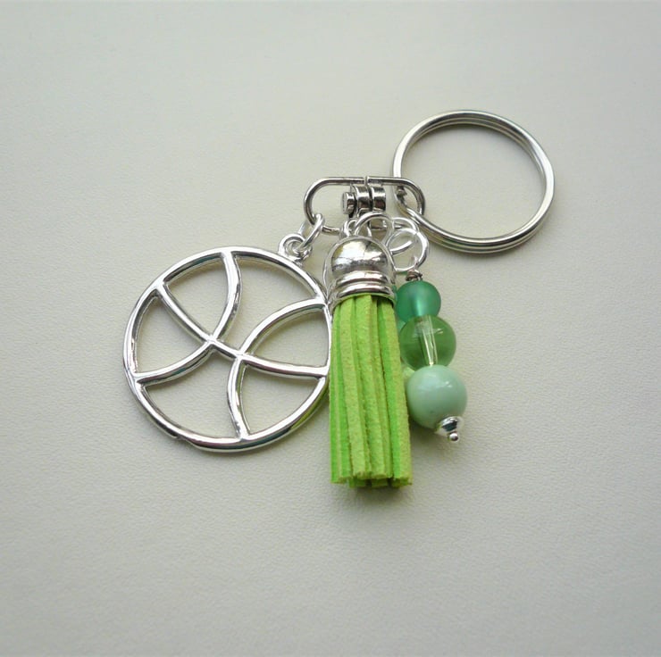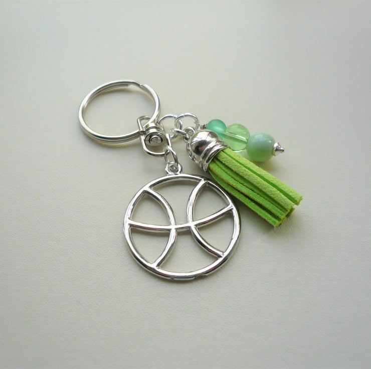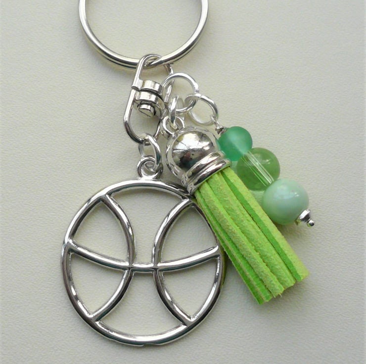 Attractive shades of green coloured PISCES Zodiac star sign themed keyring or bag charm made up of glass beads with a co-ordinating 35mm suede tassel with 30mm round silver plated Pisces symbol charm hanging below. All attached to a 25mm silver plated swivel keyring. Total length incl ring is approx 8cm.