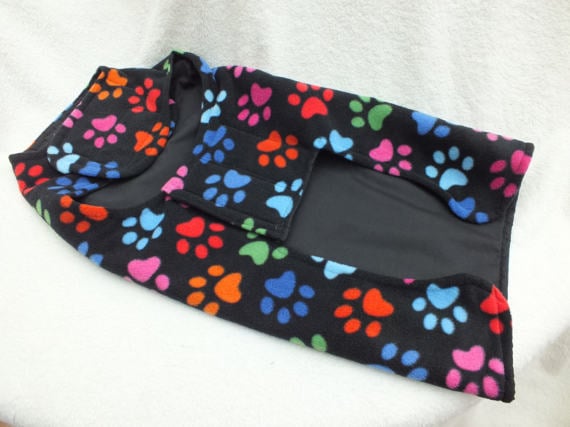 Small Dog Coat Jacket Black Poly Cotton fabric and Paw Print fleece.