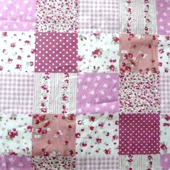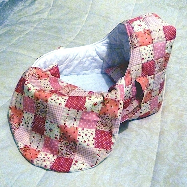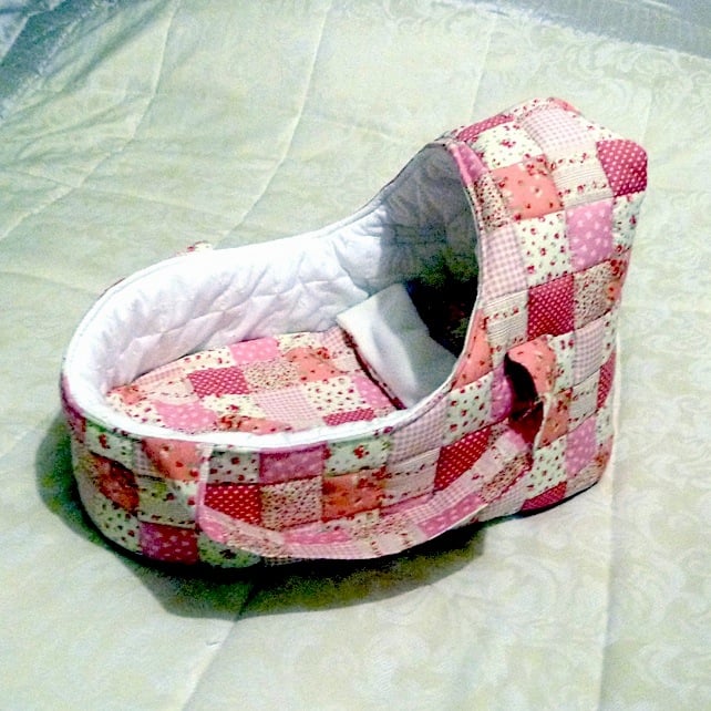 This pretty doll's carrycot is made from polyester cotton fabric which has a patchwork design .