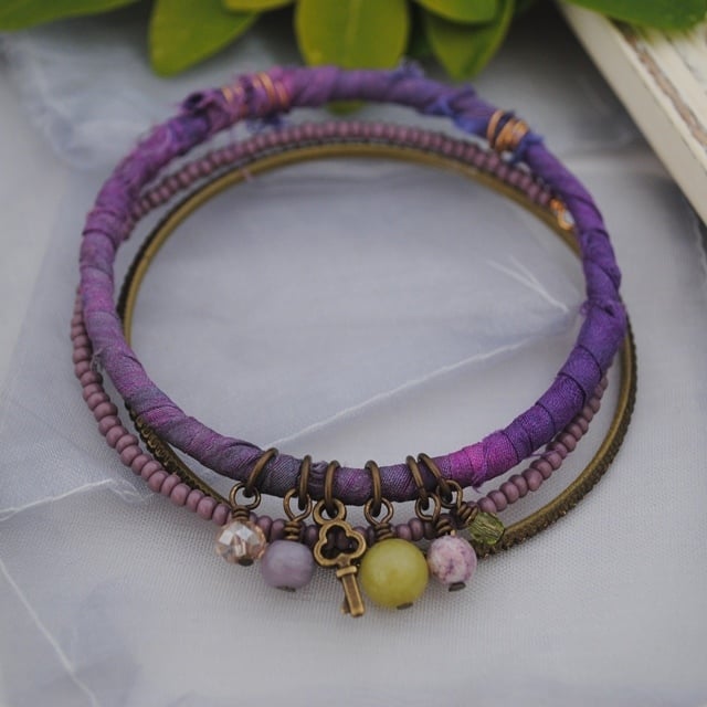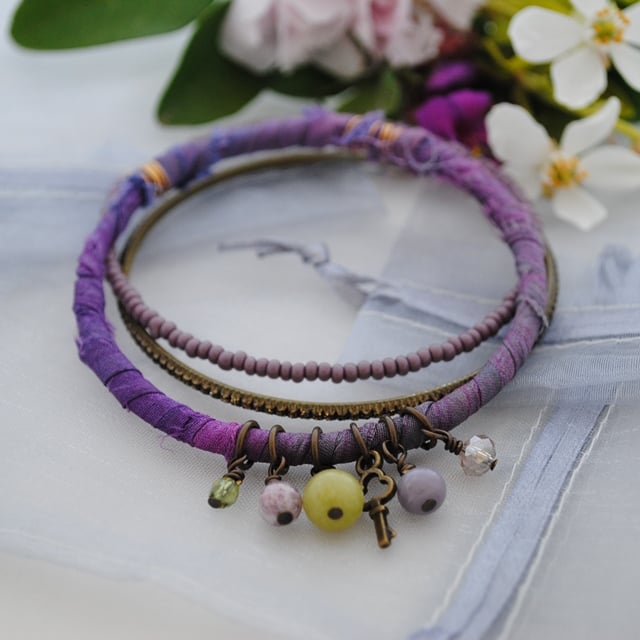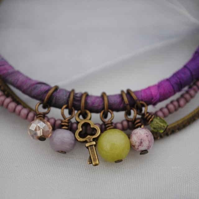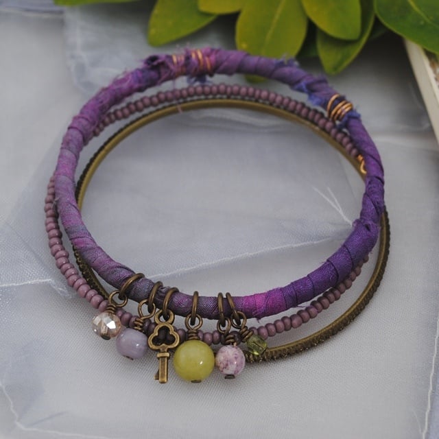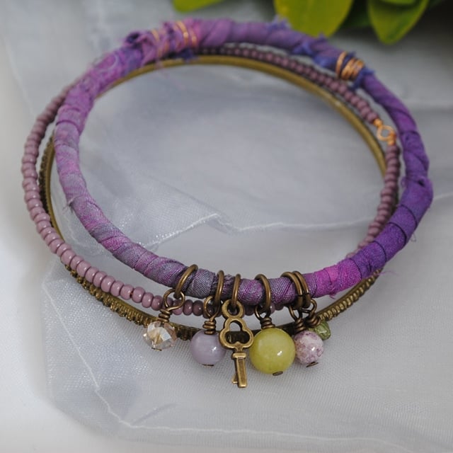 One bangle has been created by wrapping the sari silk around a bangle base. The sari silk is a lovely deep purple. The bracelet is finished with a number of bead charms in complementary colours which include an antique brass key, a jade bead, purple beads and a champagne crystal rondelle.