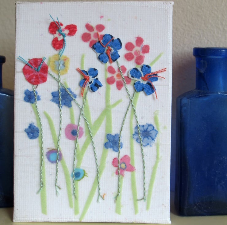 The textile artwork is collaged and stitched onto a professional artists board and the back is covered in a red and white dot print fabric. Summer Meadow measures just 9 x 6.5cm x 0.3cm, so is slim enough to frame but as it also comes with a loop it is ready to display on your wall.