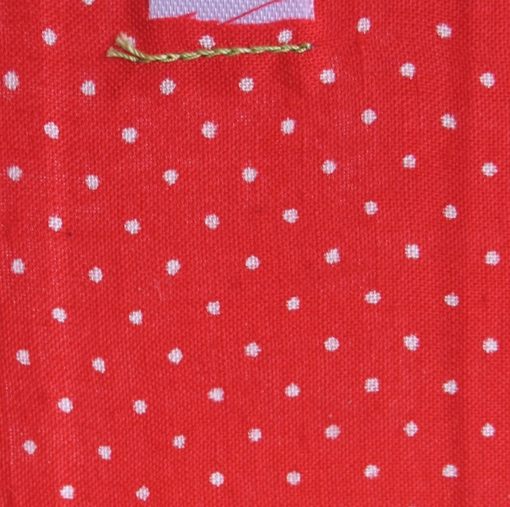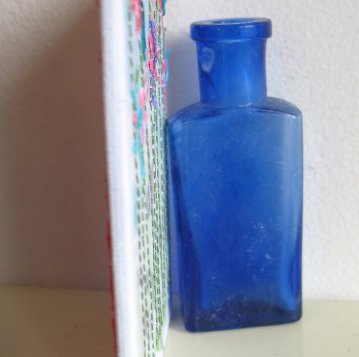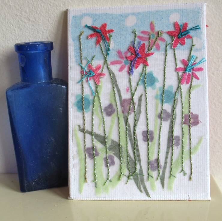 The textile artwork is collaged and stitched onto a professional artists board and the back is covered in a red and white dot print fabric. Summer time meadow measures just 9 x 6.5cm x 0.3cm, so is slim enough to frame but as it also comes with a loop it is ready to display on your wall.