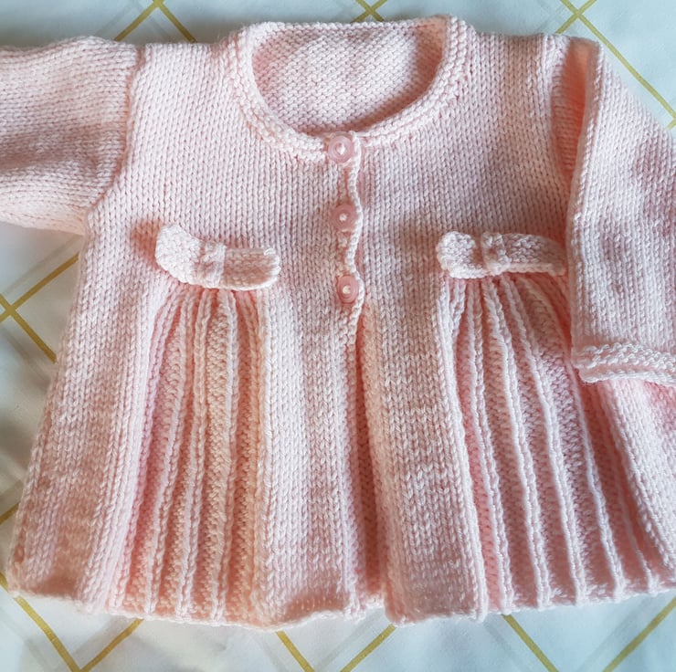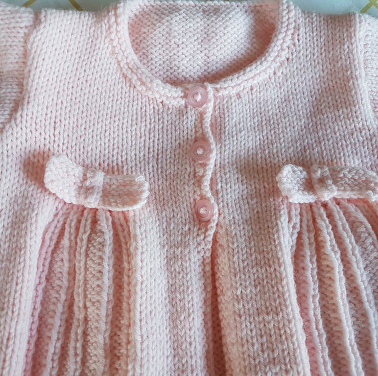 It has pleats on the front and the back and the front pleats are finished with 2 hand knitted bows.