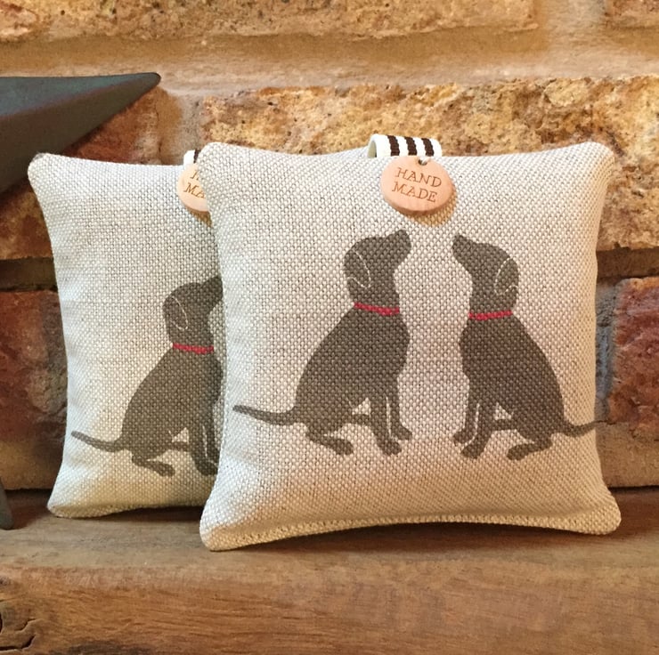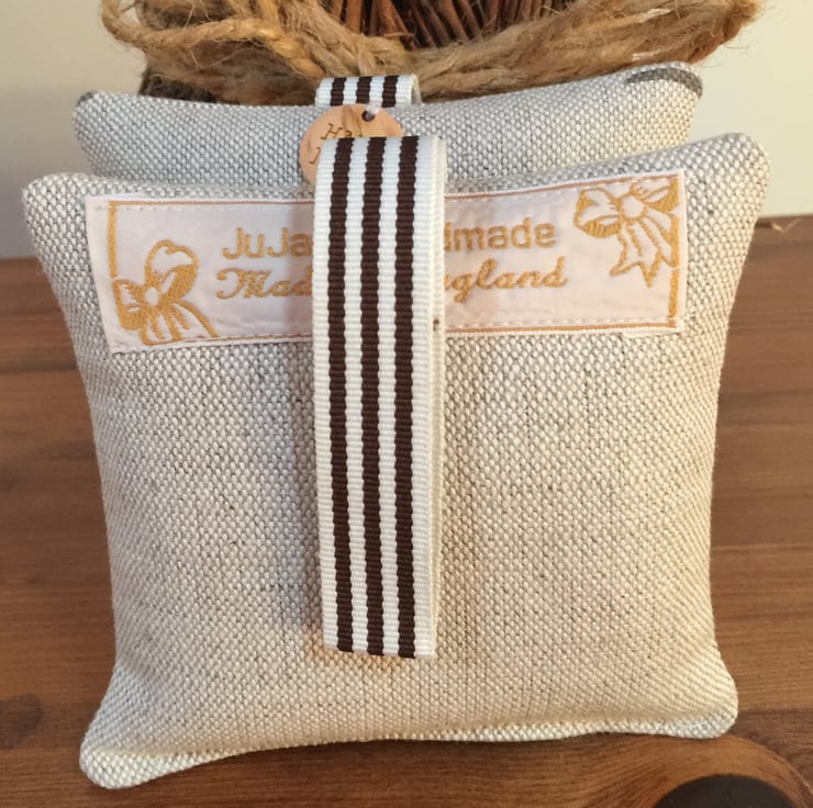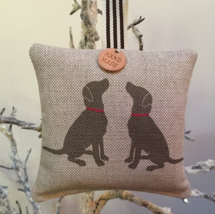 A hanging Lavender sachet constructed from a delightful brown Labrador linen fabric and backed with a natural coloured linen . Embellished with a ' Hand Made' wooden tag. Generously filled with fragrant Cotswold lavender . A lovely item perfect to fragrance wardrobes , drawers, boot/ utility rooms or alternatively just hang as a decorative item in your home.