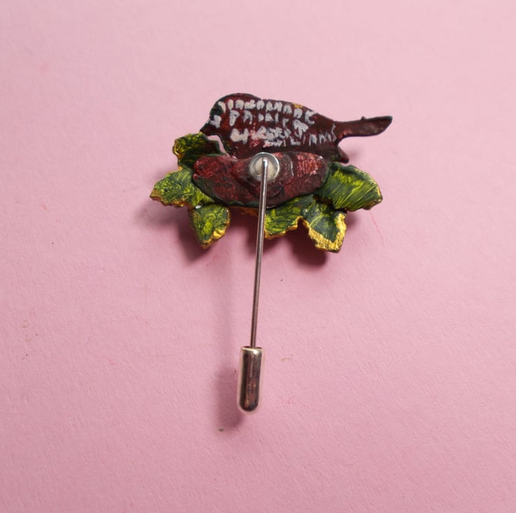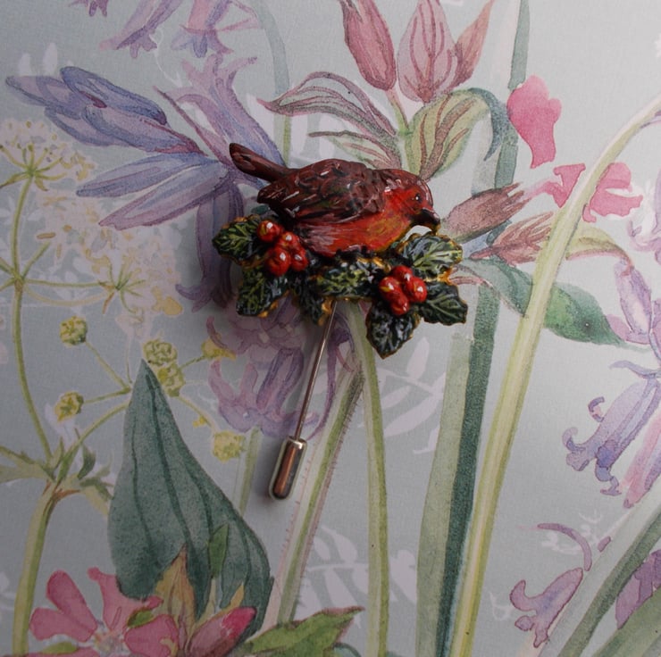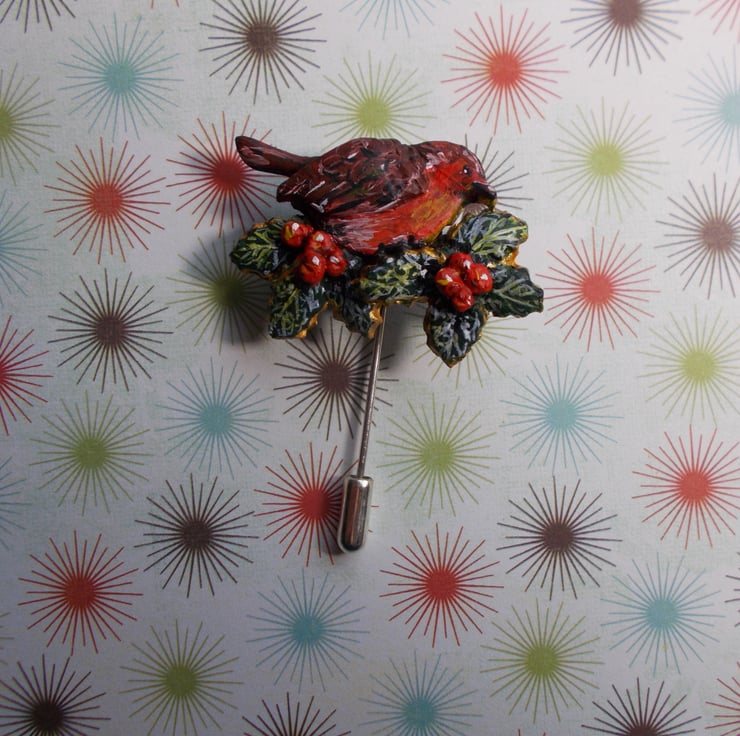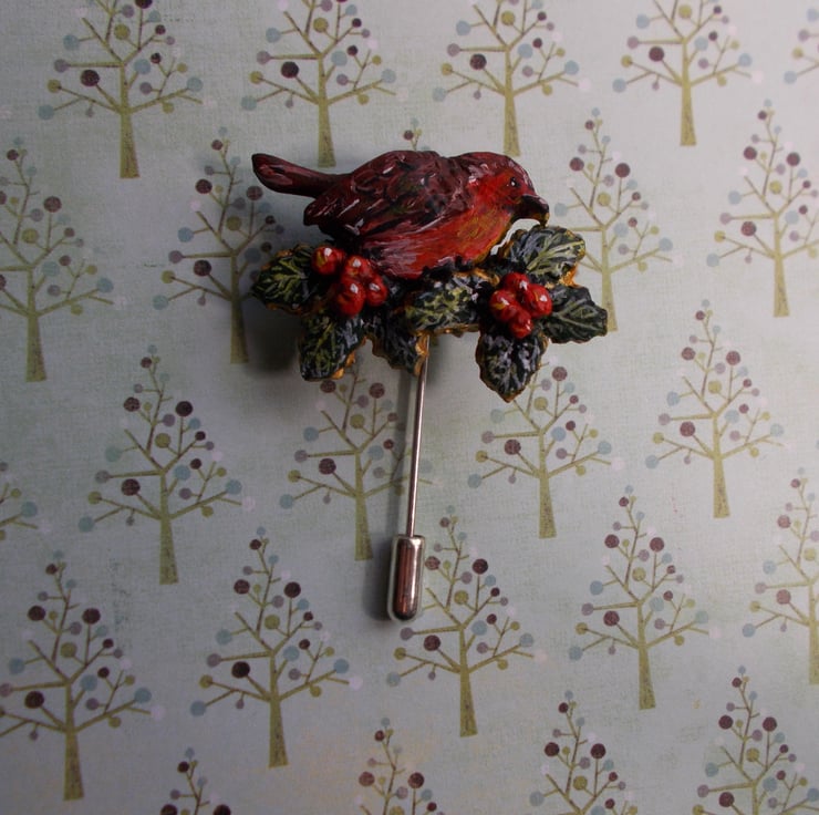 CHRISTMAS ROBIN & HOLLY PIN Festive Wedding Bird Lapel Pin HANDMADE HAND PAINTED