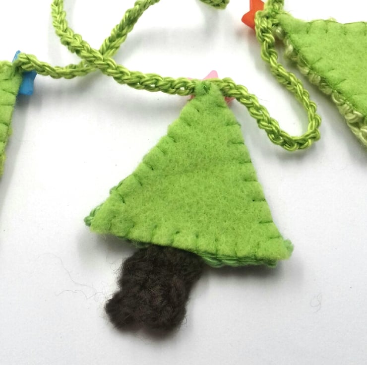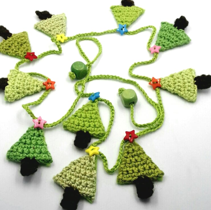 Ten crocheted trees with button stars to brighten up the festive season! The tress are made from cotton in different shades of green and their trunks from brown acrylic yarn. They are backed with craft felt for stability and have a tiny acrylic star button sewn to the top. The garland is finished with a wooden bead at each end for easy tying and measures just over 110 cm. It comes wrapped in tissue in a labelled PIP ( Postage in Proportion ) box all ready to be given or posted on.