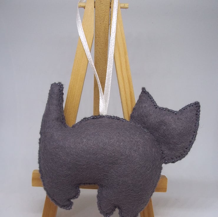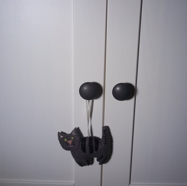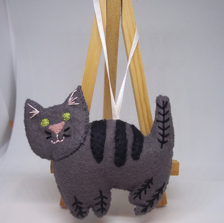 The prrrrfect gift for the cat lover in your life, or yourself if moggies are your favorite. This sweet hanging decoration would look ideal adoring anywhere in the home or even on the Christmas tree. Made of felt sheets and loving hand-stitched and embroidered details, with the body gently stuffed to give a cuddly shape. This felt feline measures approximately 9.5cm by 8.5cm (3 and a half inches by 3 and a quarter inches) excluding hanging loop of narrow satin ribbon. Created in a smoke and pet free home, designed as a decoration not a toy.