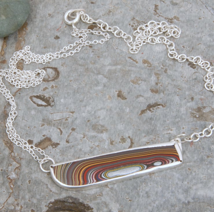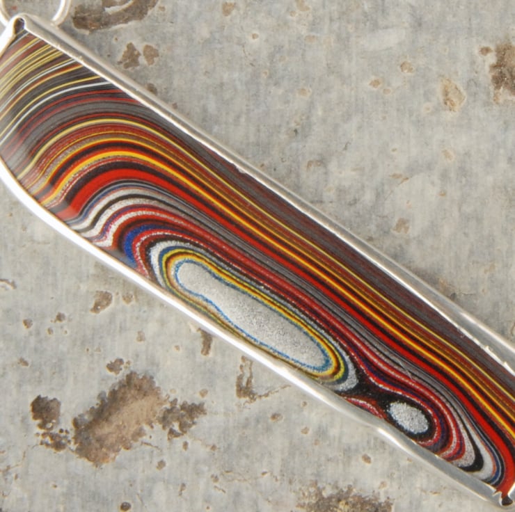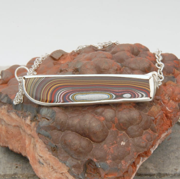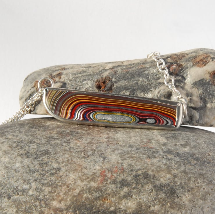 This is an unusual and contemporary necklace featuring an asymmetric piece of multi coloured fordite bezel set in sterling silver and continuing the asymmetry it is finished with different silver chains, a double strand of fine chain on one side and a single strand of thicker chain on the other. Fordite is layers of cured car paint that built up in the old spray booths, the material in this piece came from the corvette plant in Bowling Green, Kentucky probably in the early 2000s. It is very colourful with bands of red, yellow, black, blue and silver, some of which are metallic and sparkle when the light catches them. Fordite is no longer formed as changes have been made to how cars are sprayed and stocks of this material are dwindling (it was described as rarer than diamonds in an article a few years ago). Would make a good gift for any lady who loves muscle cars or the unusual.