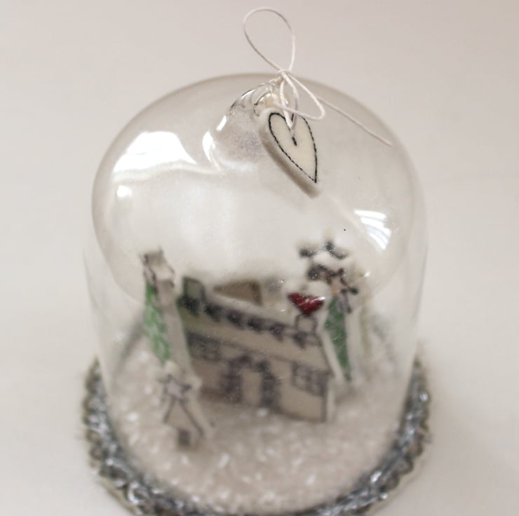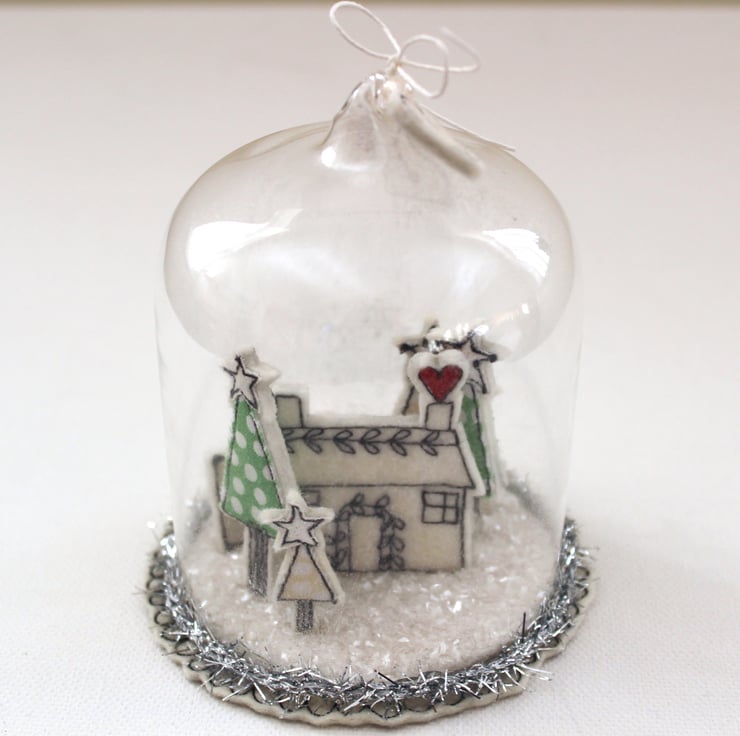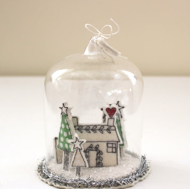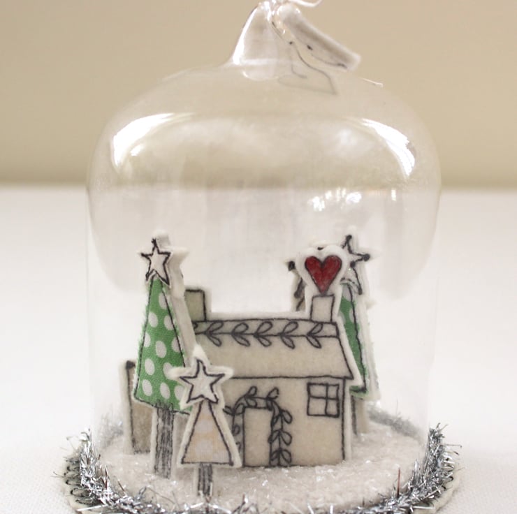 'Home for Christmas' is created using free hand machine embroidery and 100% wool felt. The festive scene is encapsulated within a glass dome, with vintage glass glitter snow (not real, sorry), a heart and a sign 'Home for Christmas'. Delicate tinsel finishes of this delightful Christmas decoration.