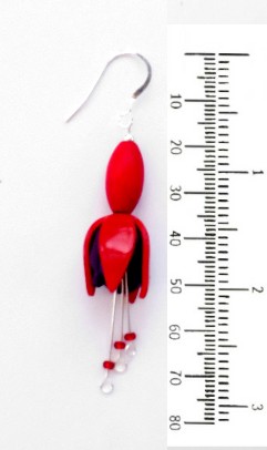 Two layers of polymer clay forming the sepals and petals, topped with an oval wooden bead. Sterling silver ear hook, spacer bead, and silver plated wires. Supplied boxed