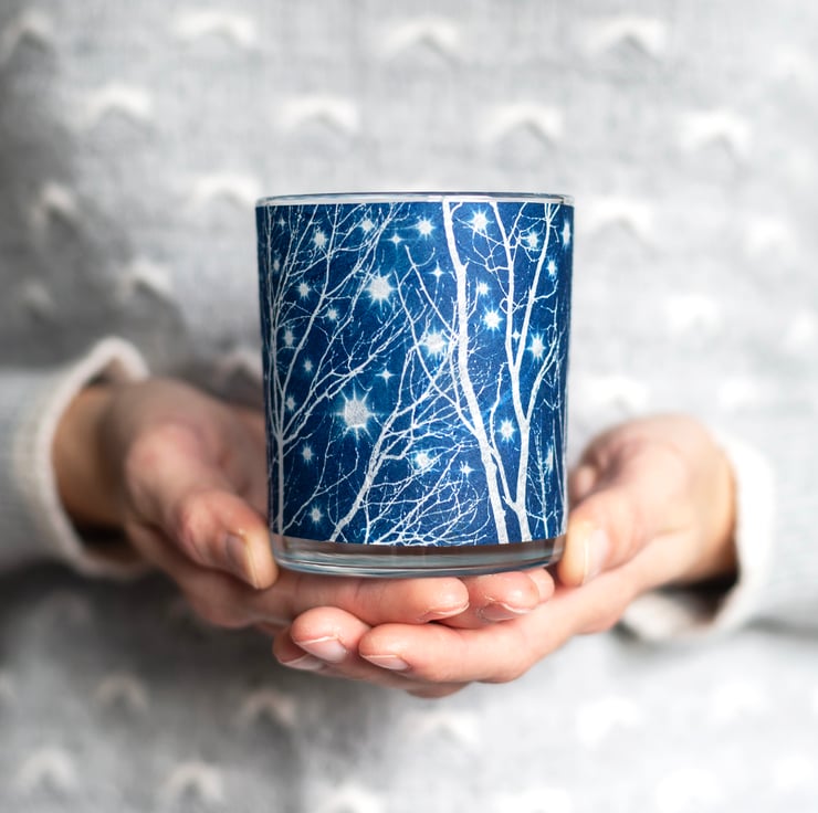 Enchanting tea light holder depicting a deep blue starry night seen through delicate Winter's tree branches. Created by applying a Cyanotype on delicate textured paper to glass.