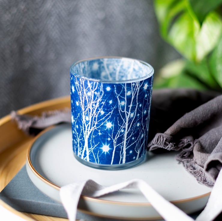Enchanting tea light holder depicting a deep blue starry night seen through delicate Winter's tree branches. Created by applying a Cyanotype on delicate textured paper to glass.