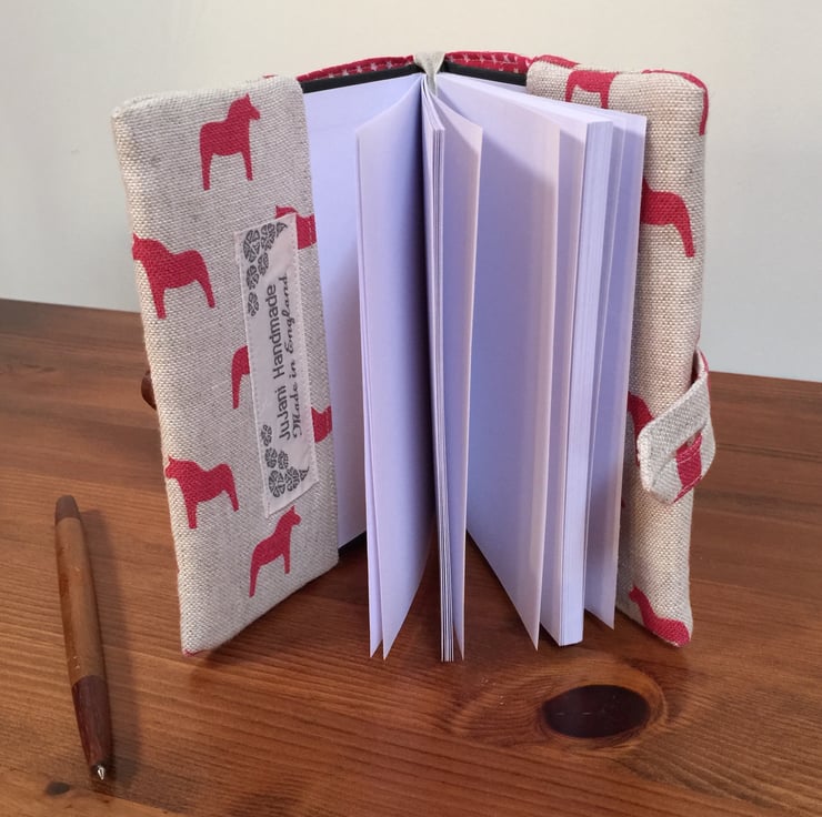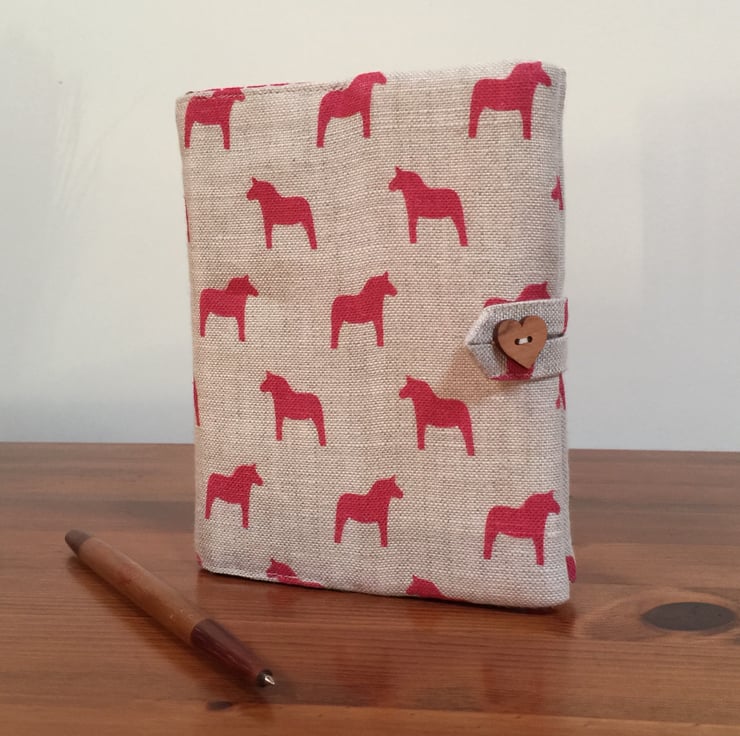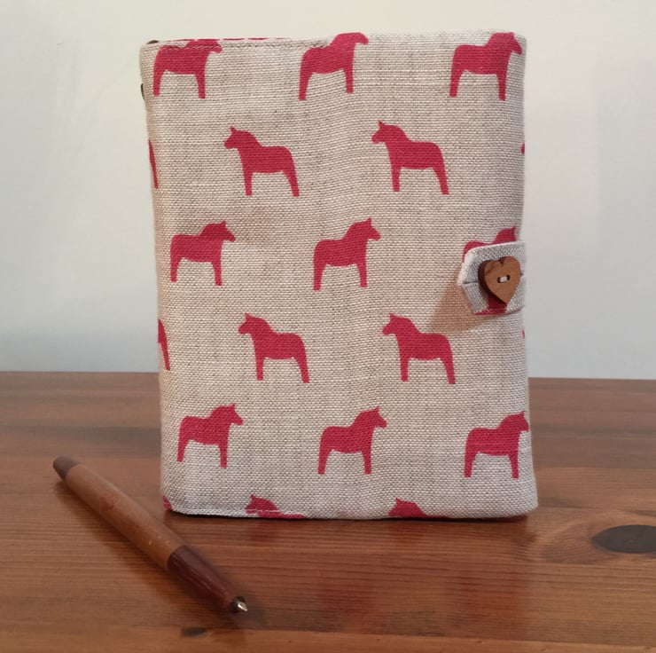 This fabric covered notebook has been made from a quality linen featuring scandi horses and lined with a contrasting star design cotton fabric.It has a fabric and wooden heart button closure and a Dutch linen tape bookmark.A delicate little mother of pearl button has been added to the outside cover for decoration.