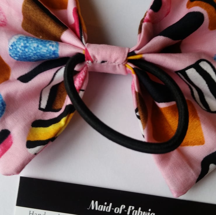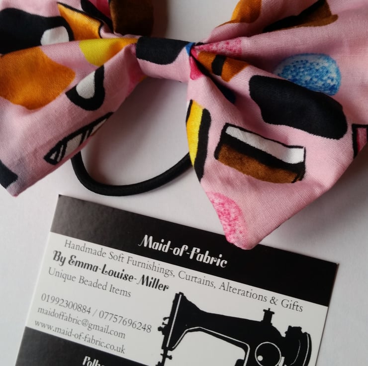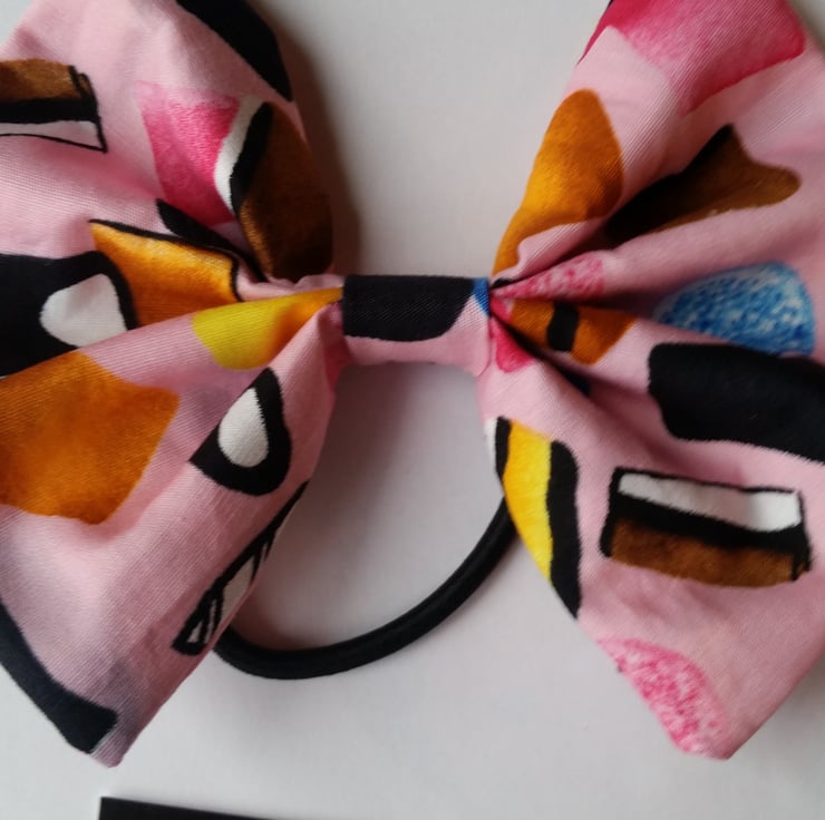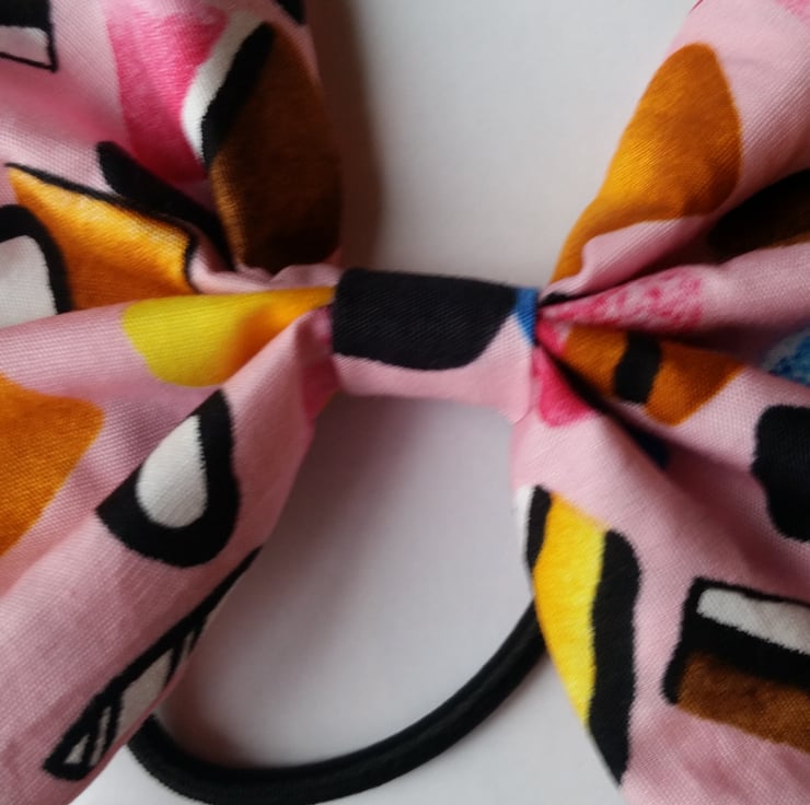 Hair bobble bow band in pink all sorts fabric.