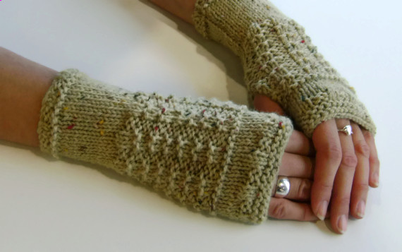 These light grey cosy fingerless gloves / mittens / wrist warmers are knitted with a pretty waffle pattern. They are made from 25% Aran wool and are 8 inches long.