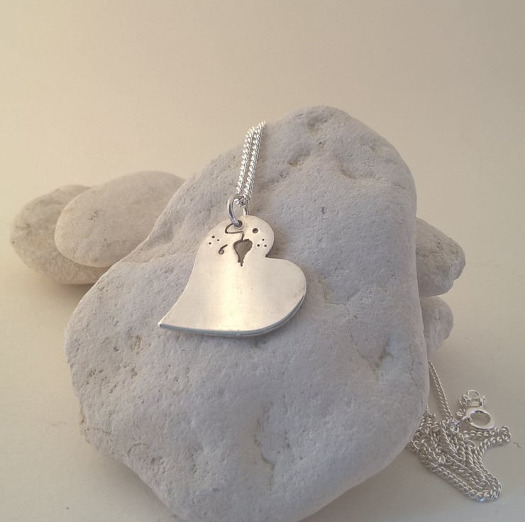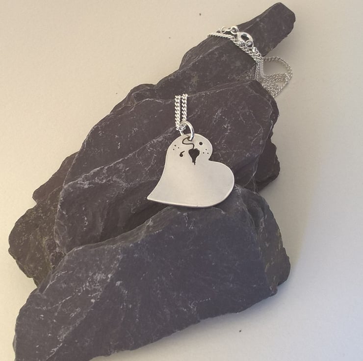 This is a heart cutout of a sheet of silver. It has a cut out leaf and tendril design in one corner which incorporates the jump ring from which it hangs from the chain. The heart measures 26 mm by 22 mm. The silver curb chain is 45 cm long.