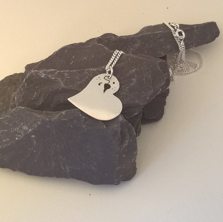 I drew a heart with a leafy design in the corner and stuck it onto the silver sheet. Using my piercing saw I started by cutting out the leaf then cut around the heart outline. 3 tiny holes were drilled, one of which was for a large jump ring, which I soldered closed. After a good polish the heart was ready to hang on the chain.