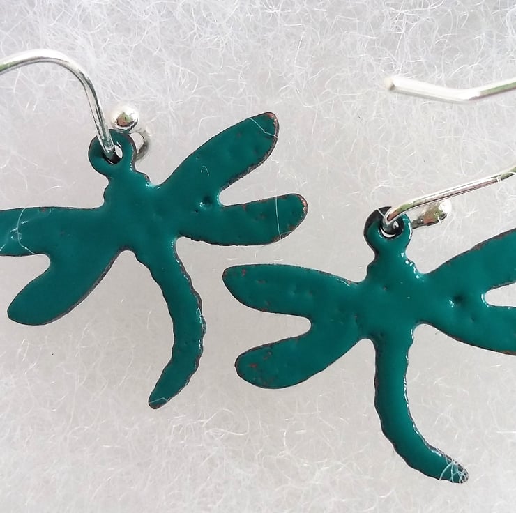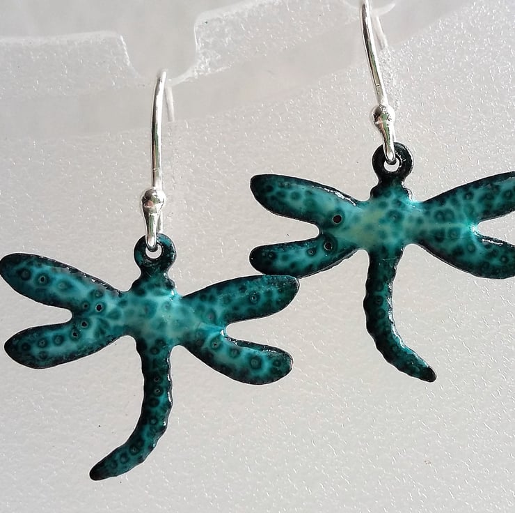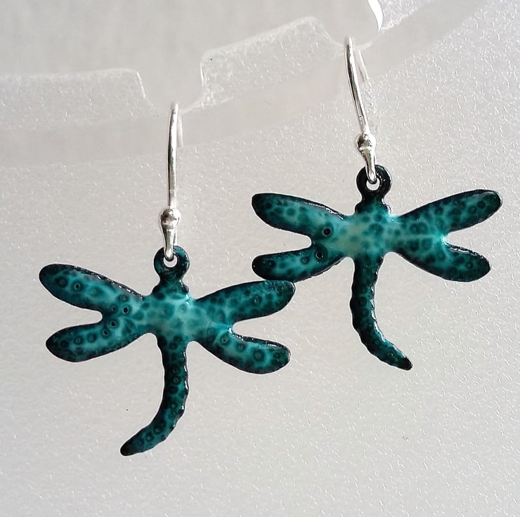 A pair of dragonfly shaped earrings enamelled in shades of sea blue and green. The earrings have been kiln-fired and each measures approximately 20mm long (to tip of tail) with a wingspan of approximately 22mm, and come complete with sterling silver earring wires. The backs have been finished in glossy turquoise enamel. They are supplied with a little organza pouch and POSTAGE IS FREE!