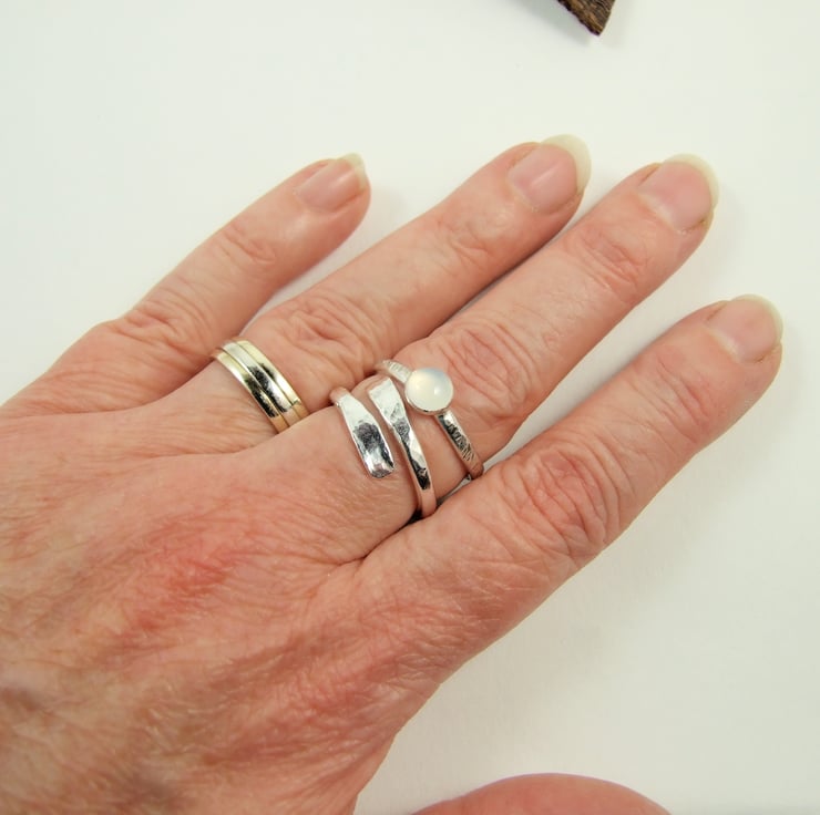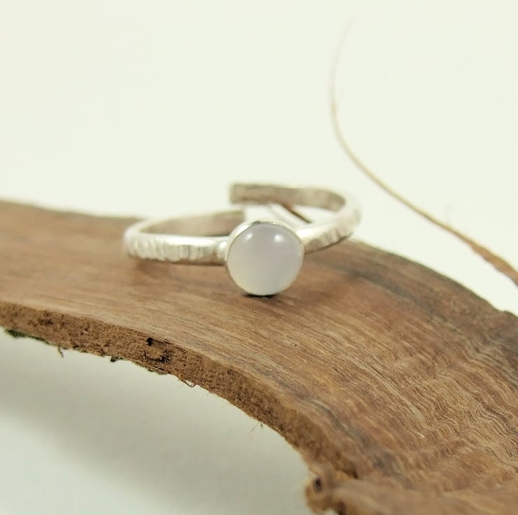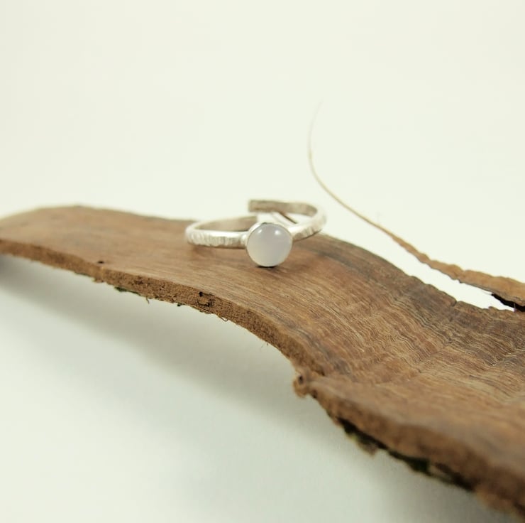 I have made the ring from 1.5mm thick sterling silver wire which had been hammered and shaped and fitted with a bezel then textured. The bezel holds a 6mm beautiful light silvery grey glowing Chalcedony cabachon. This ring will comfortably fit average UK size N-Q and is fully adjustable. If this is to fit a small or larger finger comfortably, please make a note in the comments box during purchase and I will adjust the diameter so that it sits comfortably.