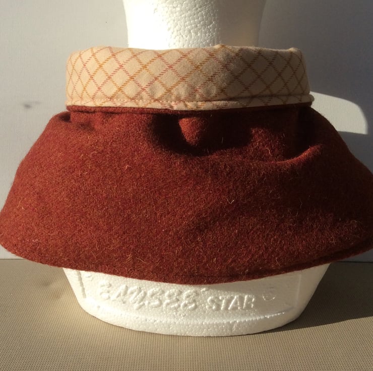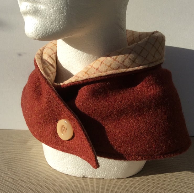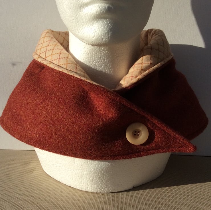 Cosy, handmade neck warmer, brick red tweed fabric. The neck warmer is lined with soft cotton and it is padded for extra comfort with a light layer of polyester wadding. It is fastened with a button hole and cream button. The neck warmer measures approximately 77cm x 19cm.