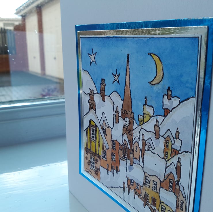 A completely handmade and uniquely designed card. Consisting of a village and church scene stamped and embossed onto white card. The scene has been hand water colour painted. Mounted onto silver mirri card, then onto blue mirri card and then onto quality pristine white card.