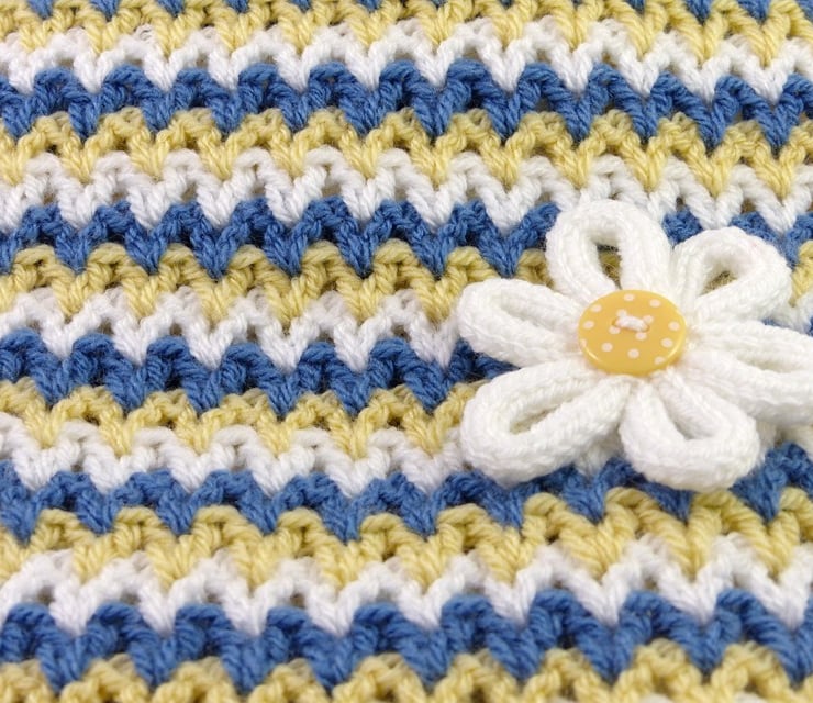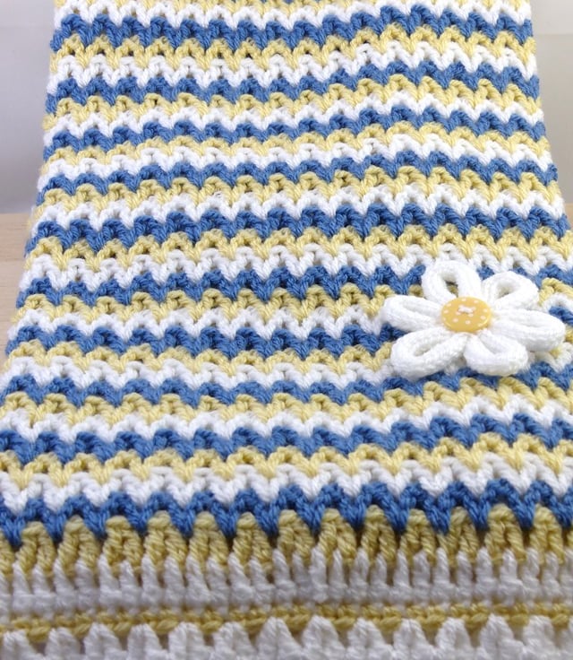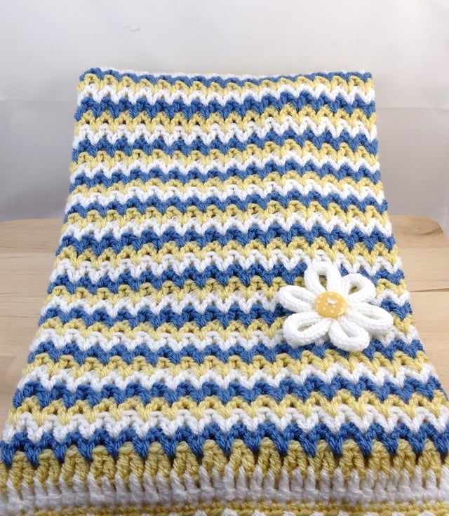 A crocheted baby blanket in denim blue, buttermilk and white 100% acrylic yarns which are washable at a low temperature. I have crocheted this item in a classic 'V' stitch and have added a white french knitted flower with a buttermilk yellow spotty button to one corner. The blanket measures approximately 28"x 24" so would be ideal for a pram, moses basket or car seat. The ideal gift for a new baby. This item will be sent by Royal Mail packed to arrive safely.