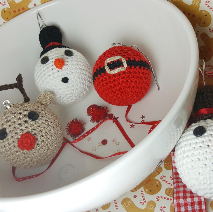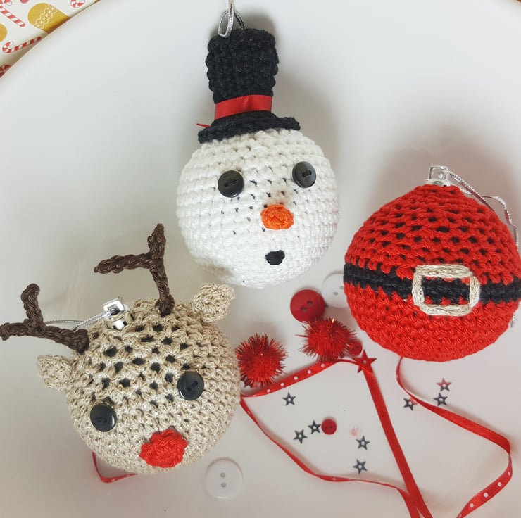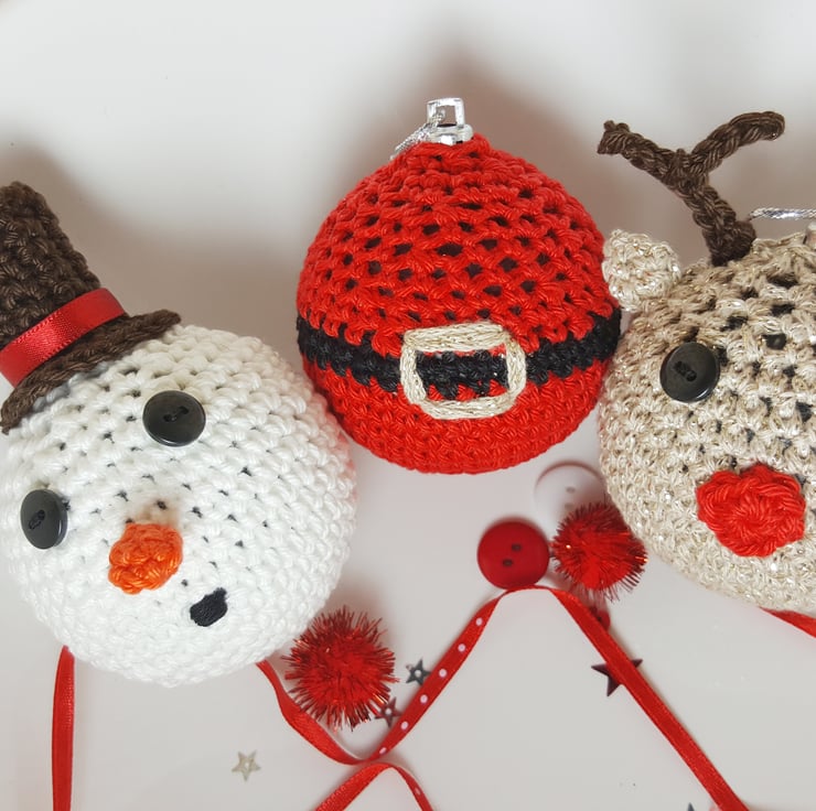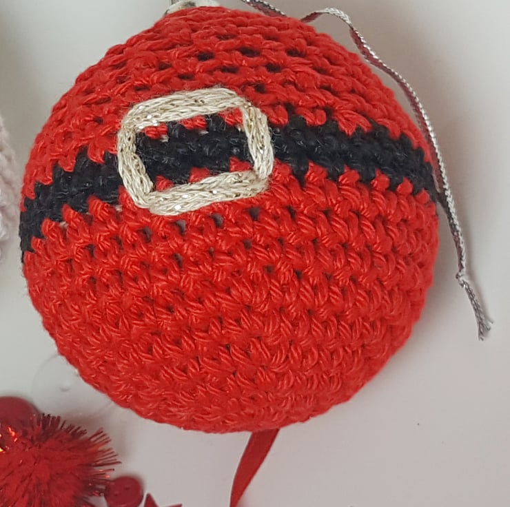 Each bauble is crocheted in top of the range cotton sheen yarn. This decoration comes with a glittery hanging loop and measures approximately 21cm in circumference. This pretty decoration will look stunning on your Christmas Tree or equally dashing in a bowl or festive table.