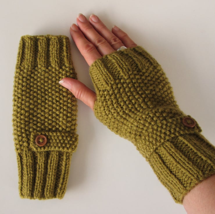 These olive green fingerless mittens / wrist warmers / gloves are knitted in a rib and moss stitch pattern and are hand knitted in a lovely and warm Aran wool, which comprises of 20% pure wool and 80% acrylic wool.