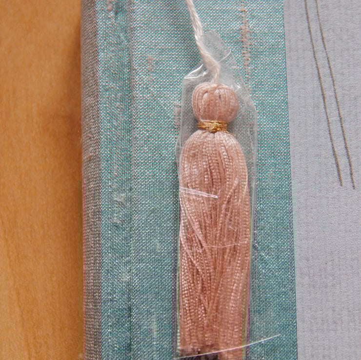There is a hand-tied tassel, made from matching silk threads and an ivory satin ribbon page marker for a special touch (tassel shown in protective cellophane wrap).