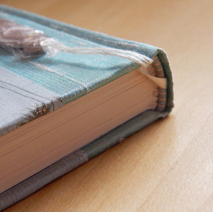 The end-papers are of matching patterned paper and the endbands are aqua and ivory.