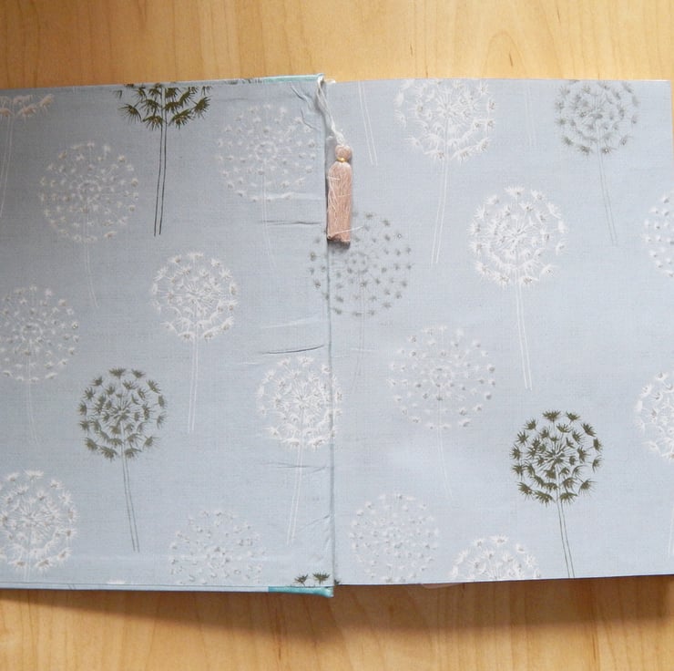 Made by hand, using traditional methods, the covers are of icy aqua blue paper, patterned with dandelions in ivory and grey, with frosty shimmer highlights.