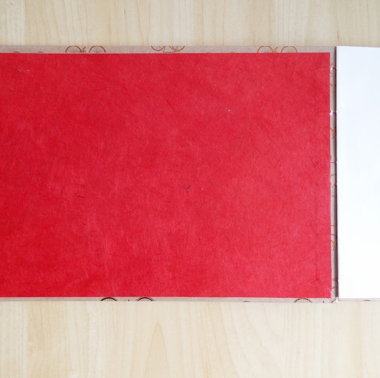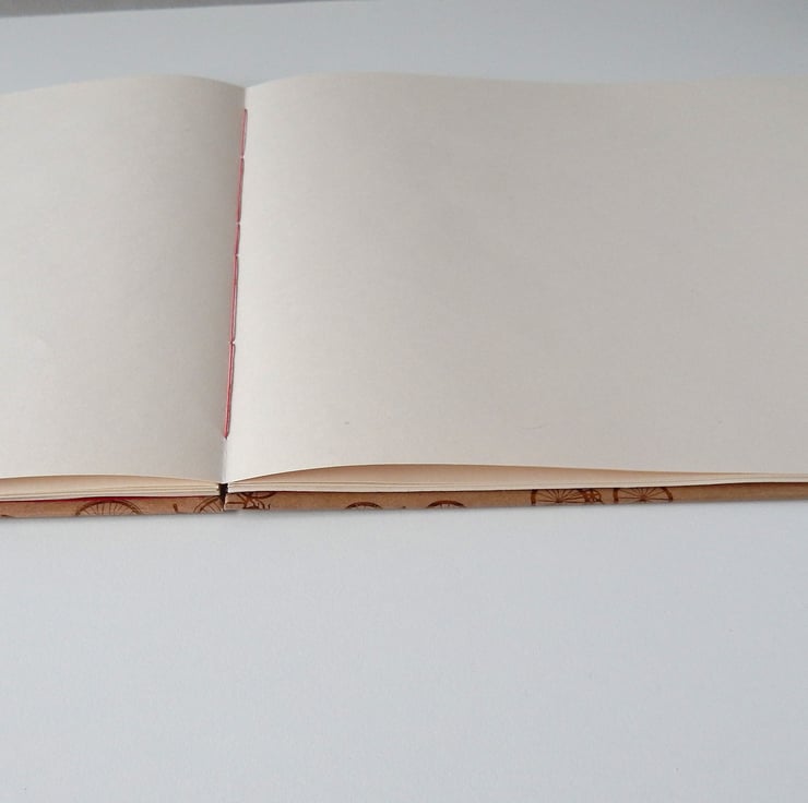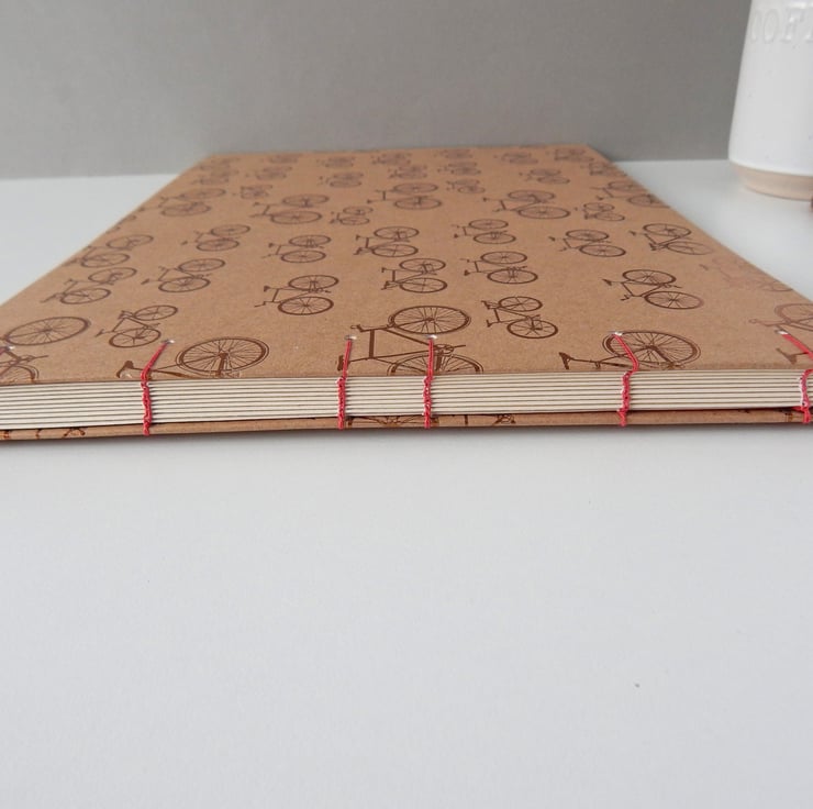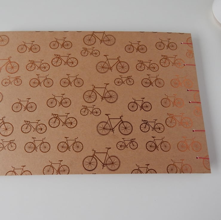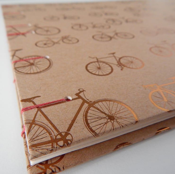 - Hand made with a Coptic binding sewn in red linen thread. The covers have a pattern of little bicycles, printed onto kraft paper with shiny copper ink.