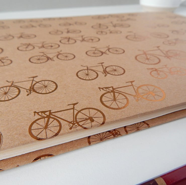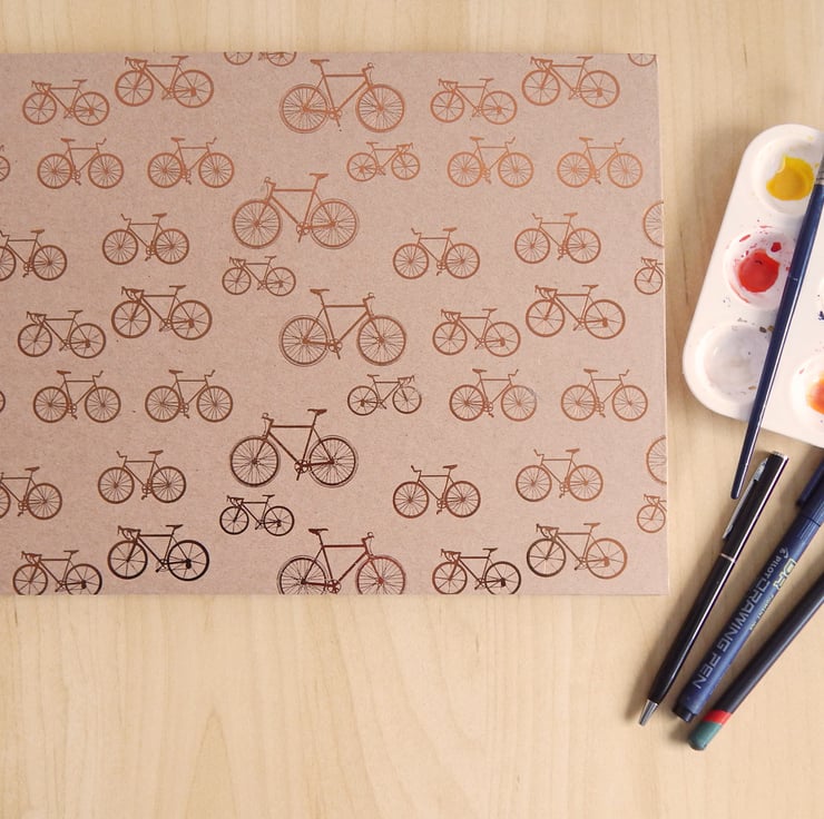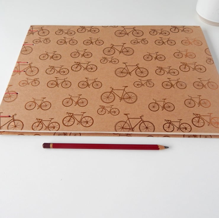 A4 Large hardcover landscape sketchbook with a design of bicycles on kraft paper covers.