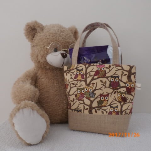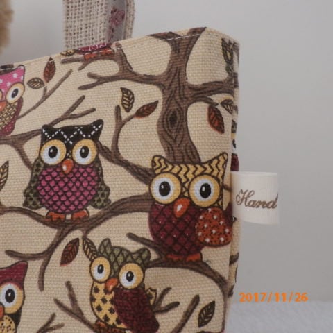 This cute little girls mini tote bag, is made from a cotton fabric, with a canvas look to it, it has multi coloured owls sitting on tree printed on the fabric.