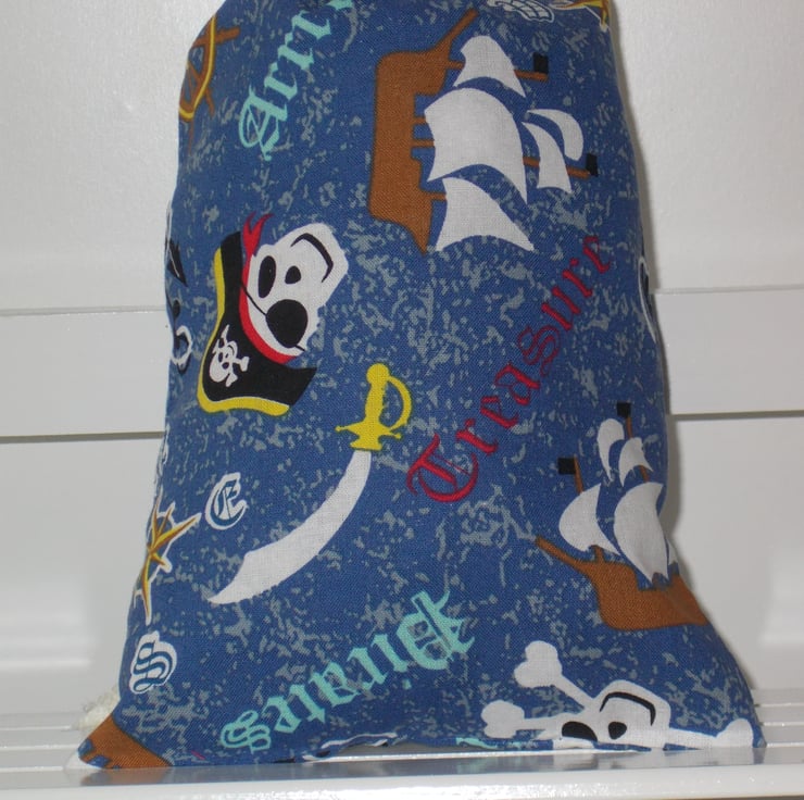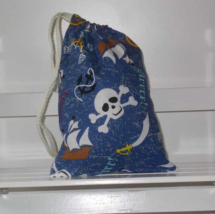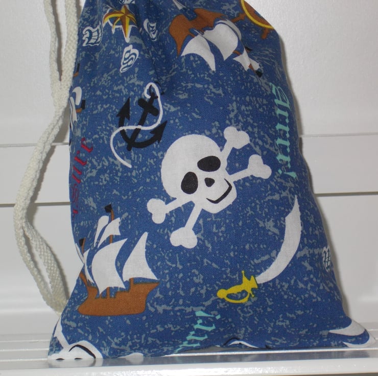 The print on this bag is of skull, ships, swords on a blue background. with a drawstring.