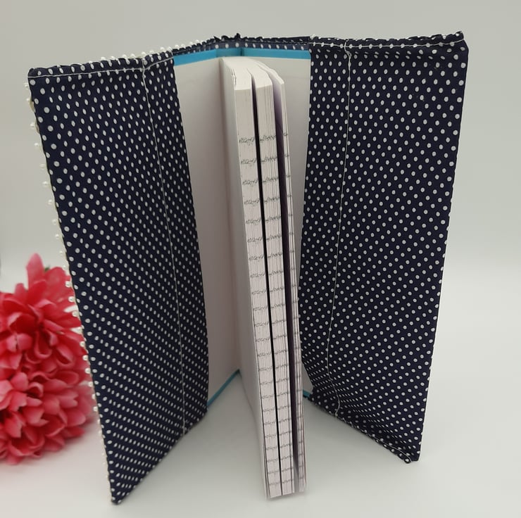 Notebook with a navy polkadot fabric cover.