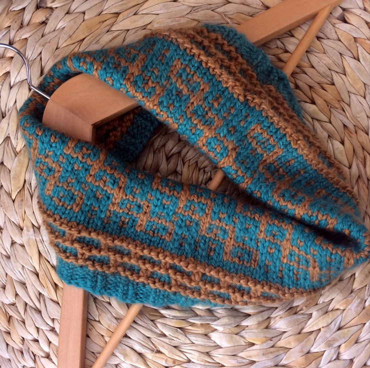 Beautiful scrumptious cowl using slip stitch knitting with a geometric pattern down the centre flanked by a textural brick pattern and ribbed edging. Knit in - 60% baby alpaca, 30% Merino wool, 10% silk.