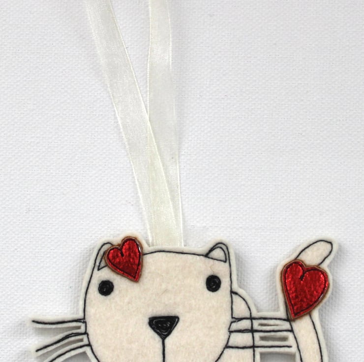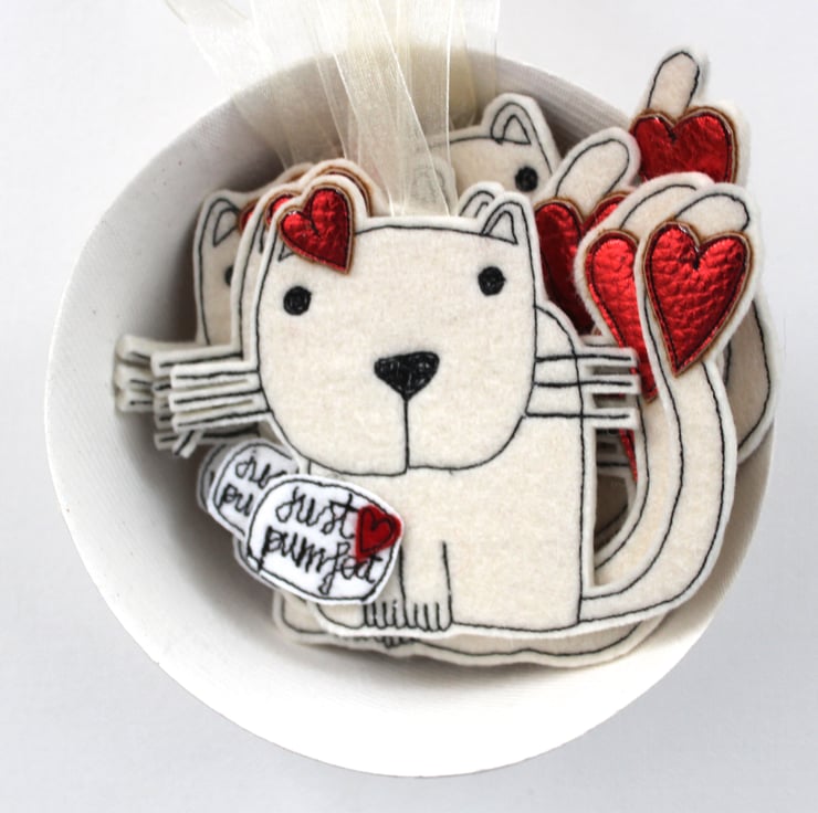 Meet 'Just Purrrfect Kitty', she wears a sewn red metallic heart on her head, has a red metallic heart on her tail with a sewn fabric label 'Just Purrrfect'. Kitty is made using 3mm thickness, 100% wool felt.