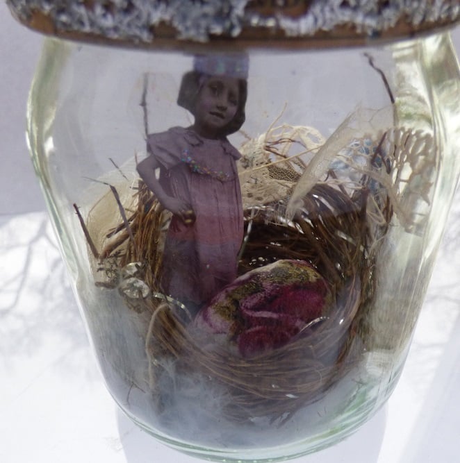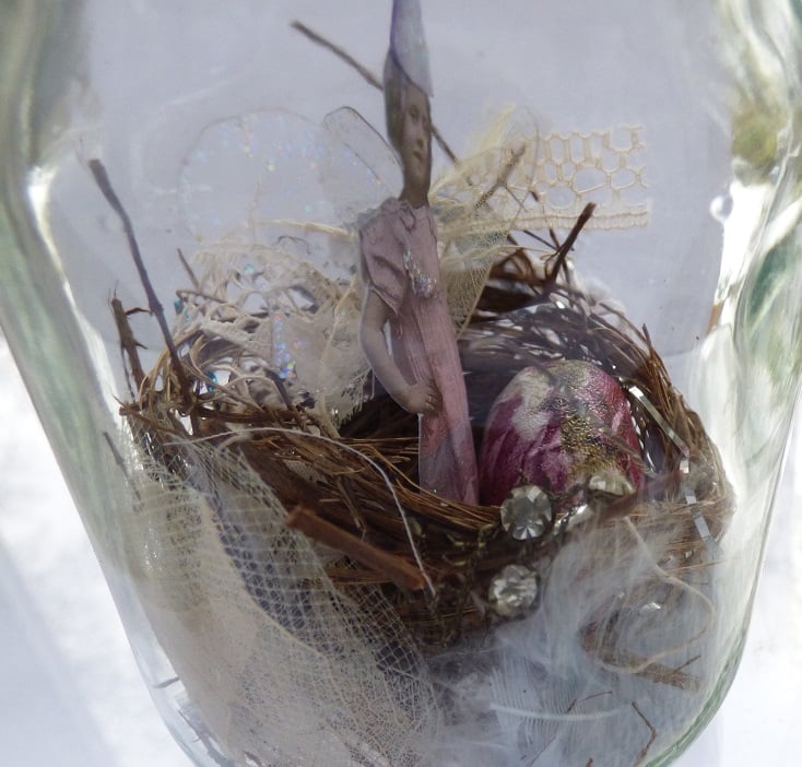 I have decorated a 7x10cm glass jar, the lid shows the cover of a book on birds and nesting. Inside the jar is a little Edwardian girl fairy complete with sheer sparkly wings. She stands in a birds nest with a big shabby chic style crackled egg. Also surrounding her are a collection of ribbons, bits of lace, feathers and skeleton leaves giving a vintage feel to the piece.