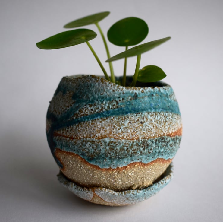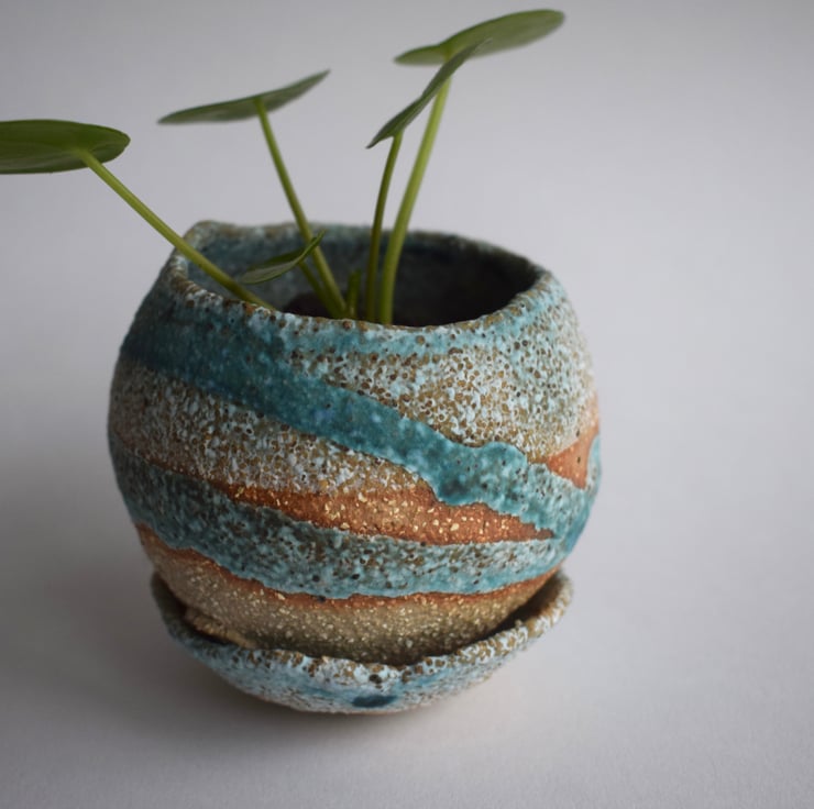 Pebble and shell ceramic planter in buff stoneware clay and bright turquoise glaze.