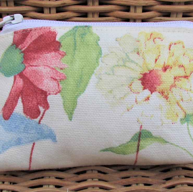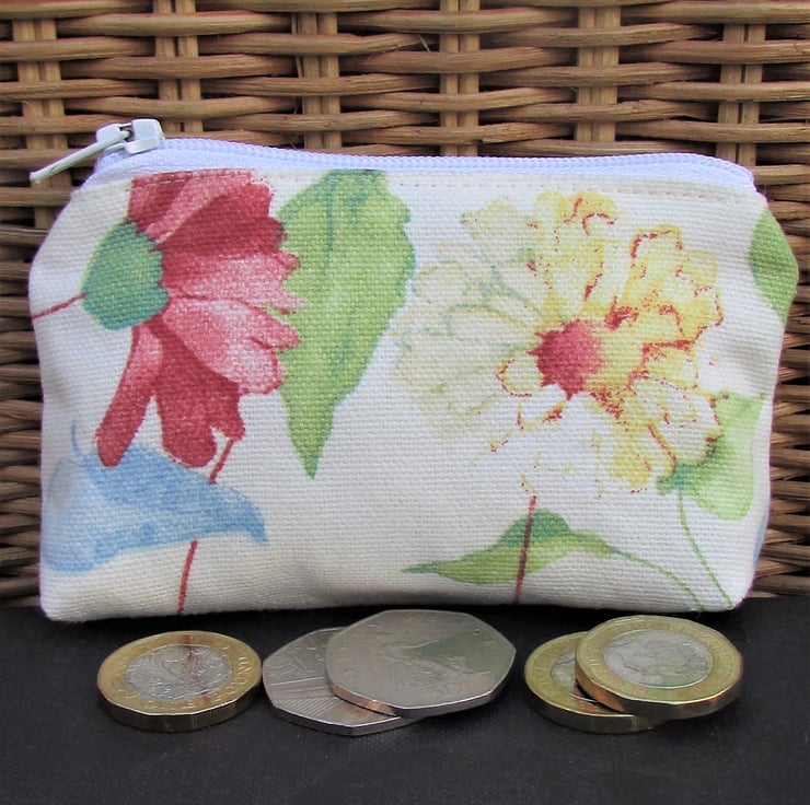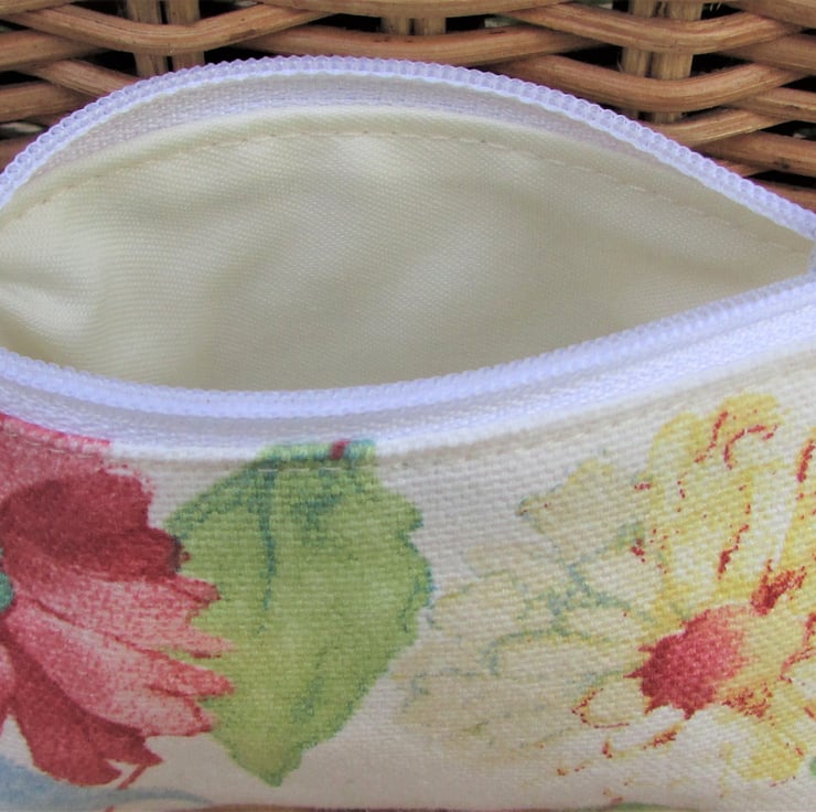 A small coin purse with a pretty floral print pattern in shades of pink, yellow, green and blue on a pale cream background. The coin purse has a white zip and is lined with cream fabric. The base of the purse is boxed to give a spacious interior.