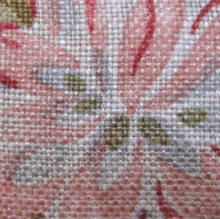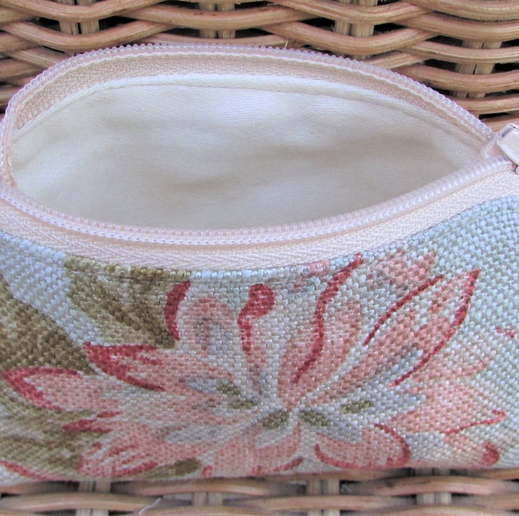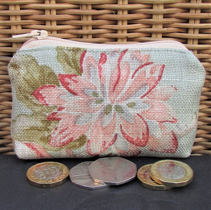 A small coin purse in a loosely woven pale green fabric with a pretty pattern featuring a large flower in shades of pink and sage green leaves. The coin purse has a cream zip and is lined with cream fabric. The base of the purse is boxed to give more space inside.