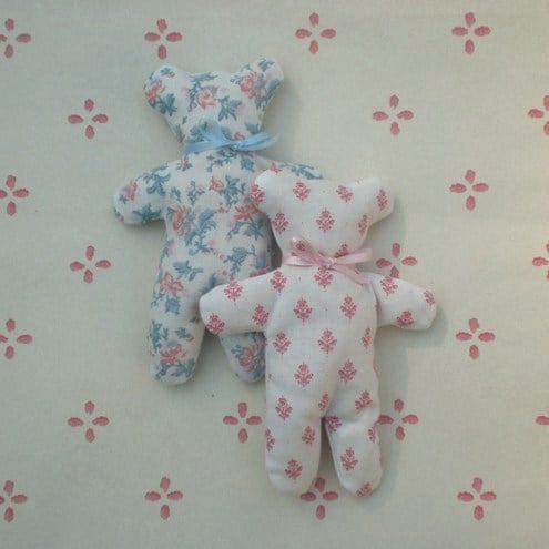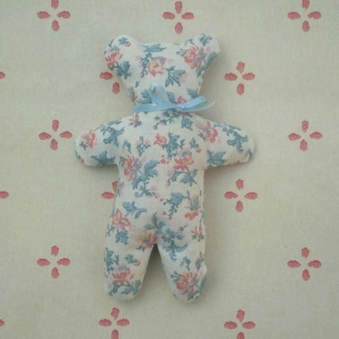 Bean bag bear trimmed with a narrow satin bow. Could be used as a paper weight, decoration or to hold and de-stress by. Made from vintage Laura Ashley cotton floral print filled with split peas. Length 13cm