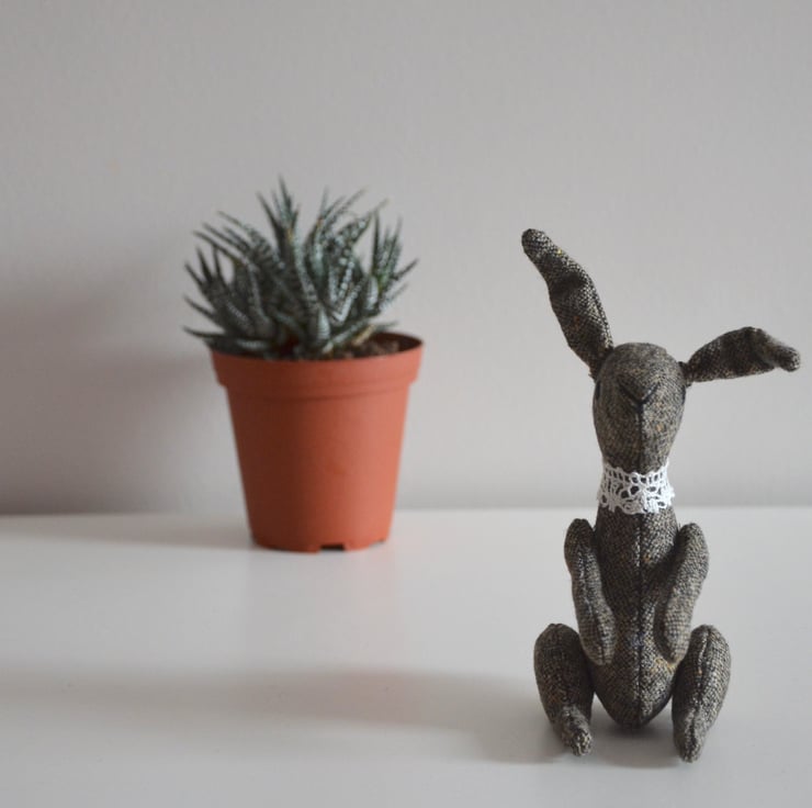 This here lovely rabbit was made to see the world from a special place in your home. Created to add character and bring joy. Decorated with the fluffiest tail and delicate lace collar around her neck and made from speckled wool fabric.