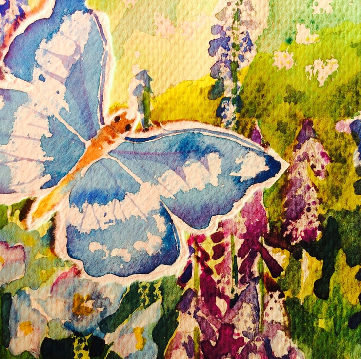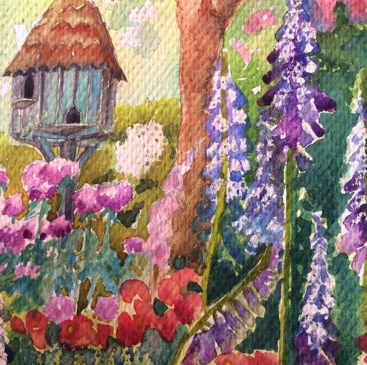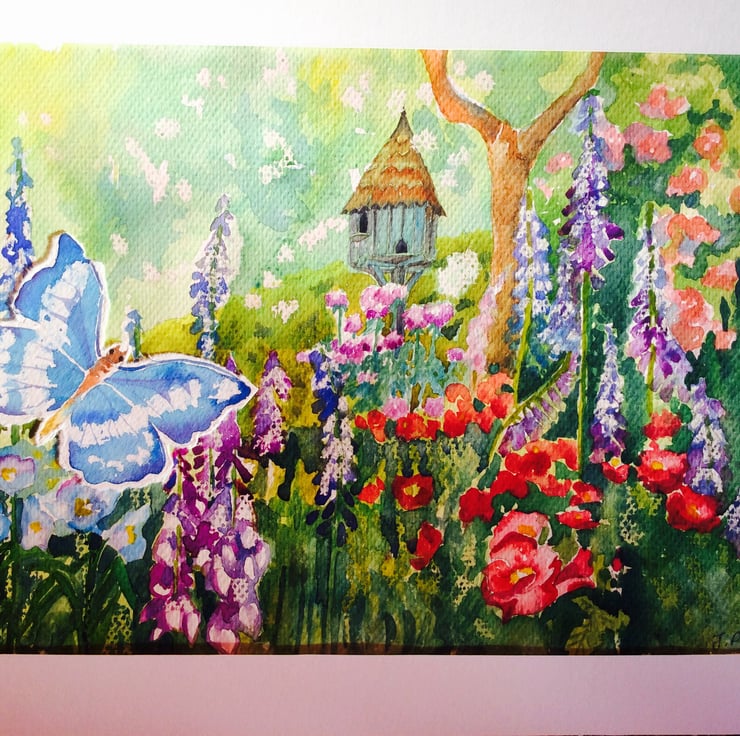 This painting depicts a country garden with wildflowers, dove cot and butterfly. The painting comprises of a range of watercolour techniques such as wet-on-wet and wax resist which is in keeping with my style of artwork. There is an impressionistic feel to my work which is illustrated in this piece of work. The butterfly has been painted, cut out and stuck onto the painting to add a three dimensional feel. This is an original painting not a print. The dimensions are approximately 33cm x 23cm without mount and 40cm x 30cm with mount.