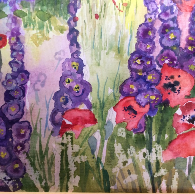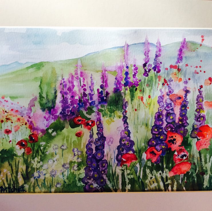 The painting depicts a meadow of purple foxgloves and red poppies. A number of watercolour techniques have been used such as wax resist and wet-on-wet to create an impressionistic style which is in keeping with my artwork.