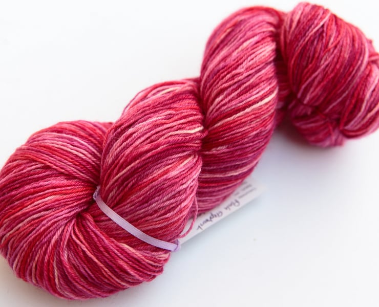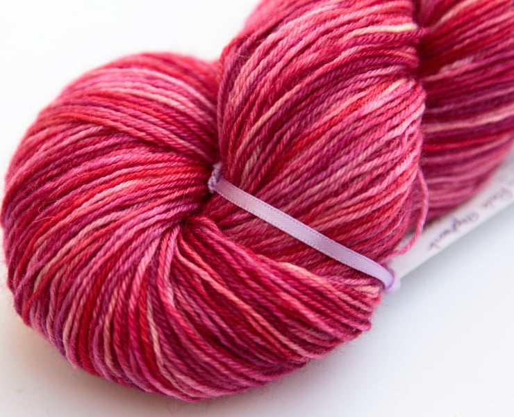 Bright shades of pink and amaranth with some lighter sections. This Bluefaced Leicester superwash yarn is soft with a very slight lustre. Photos taken and edited in bright natural light.