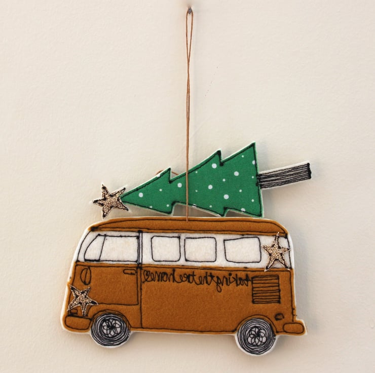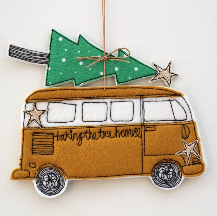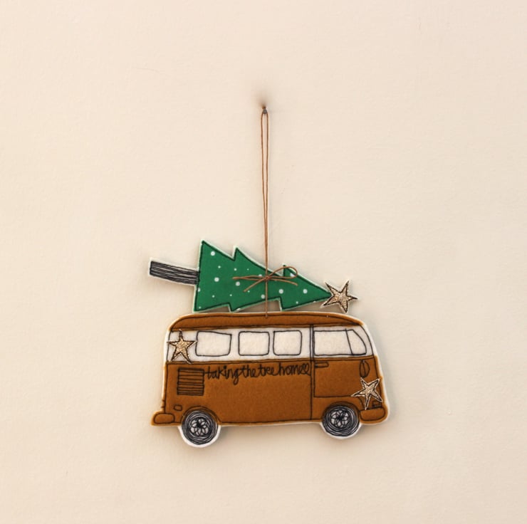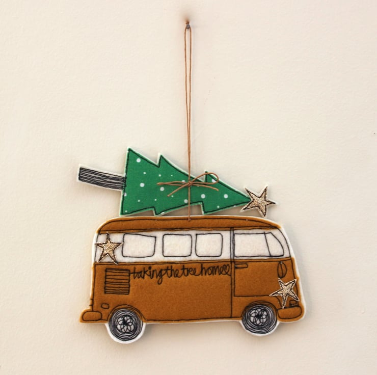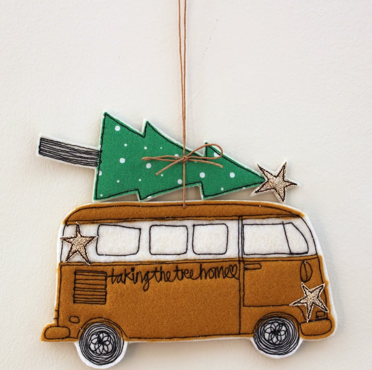 Taking the tree home is created using 100% cream wool felt, printed cotton cloth, glitter cloth and free hand machine embroidery. As each decoration is unique, please be aware that the Christmas tree fabric will be different for each.